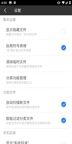 2、设置界面具备隐藏文件、管理文件等功能,同时支持对文件进行分类操作。