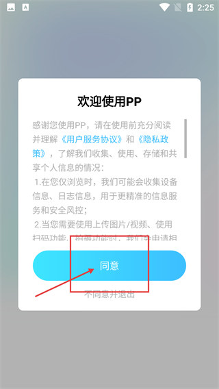 1、进入【PP】的欢迎界面后,仔细阅读【用户服务协议】与【隐私政策】的相关内容,点击【同意】按钮,就能进入接下来的登录流程。