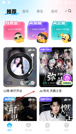 4、登录后进入【推荐】主页,能看到【找男生】-【来点唱】这类功能入口,还有【心晴-新厅开业】等推荐内容,大家可以根据自己的需求参与互动。