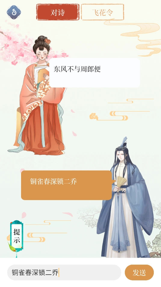 2、在对诗界面,系统会先给出第一句诗,接着用户在下方输入对应的诗句,之后点击发送按钮即可。