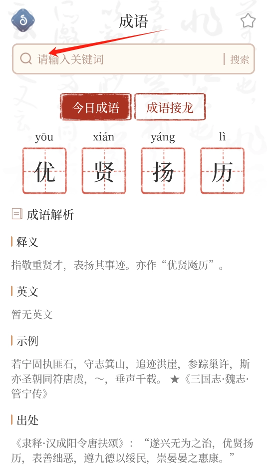 3、成语界面的最上方设有搜索框,输入成语关键词即可查找目标成语,搜索结果会在下方展示,包含释义、示例、出处等相关内容。