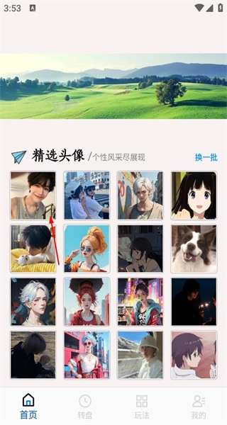 打开软件进入首页后,能看到精选头像板块,这里展示着多种风格的头像,旁边还有“换一批”的选项,方便挑选自己喜欢的头像来使用。