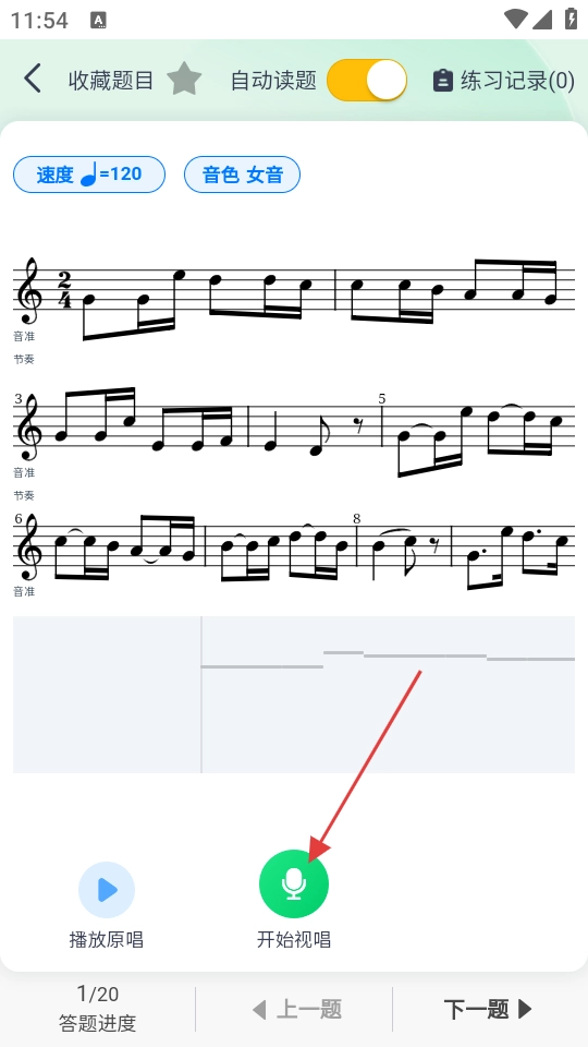 4、在答题界面点击【开始视唱】,即可开始视唱练习,同时可利用播放原唱等功能辅助练习。