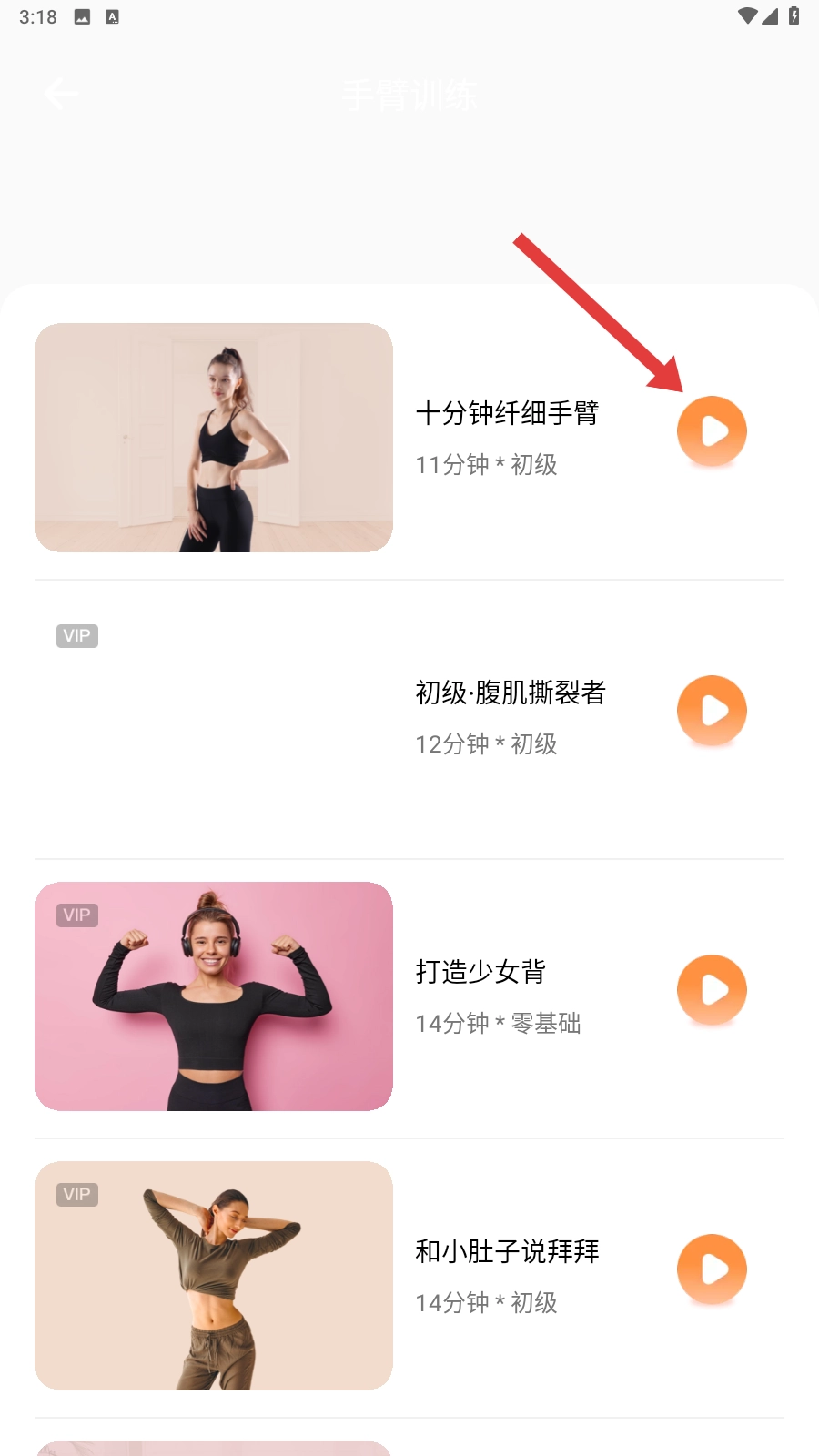 3、在手臂训练课程列表里找到【十分钟纤细手臂】这门课,点击它右边的播放按钮,就可以准备开始训练了。
