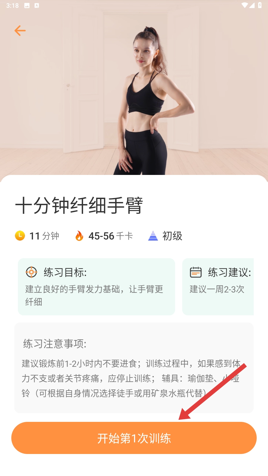 4、进入【十分钟纤细手臂】课程详情页后,点击底部的【开始第1次训练】按钮,就能正式启动手臂锻炼。