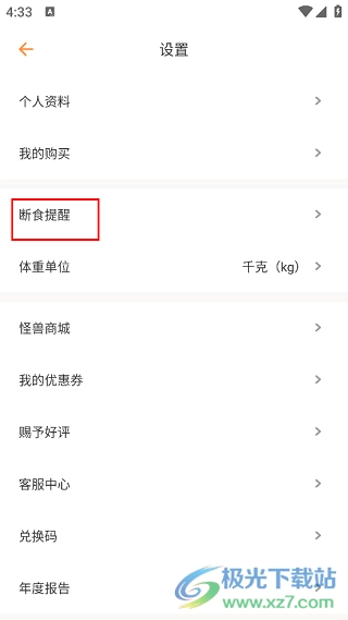 3、轻点一下就能进入“设置”界面,接着在列表里选择“断食提醒”这个选项。