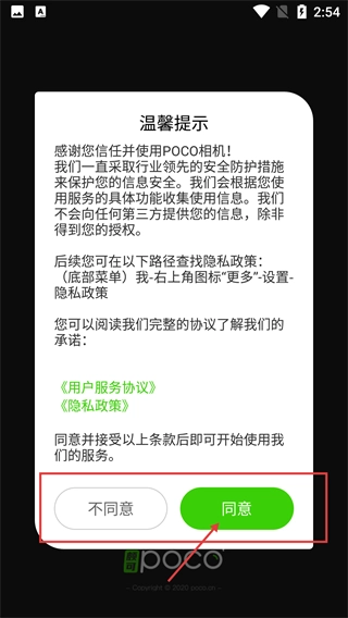1、仔细阅读【POCO相机】的【用户服务协议】与【隐私政策】,确认无误后点击【同意】按钮,就能进入应用的主功能界面。