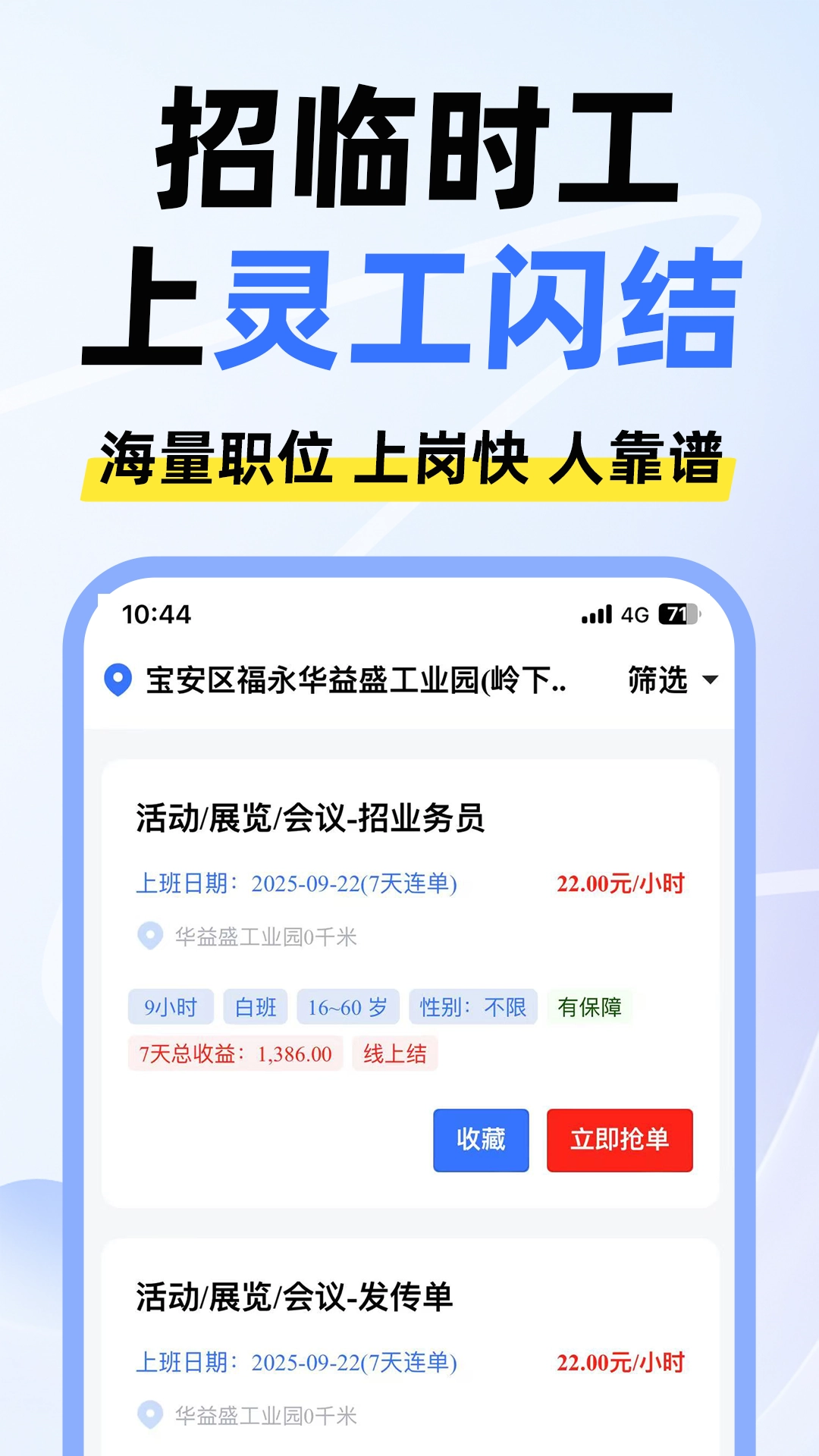 灵工闪结是一款更新超多零工兼职信息的本地服务软件,处于失业状态的各位,可以合理安排个人时间,在线获取高薪零工机会,一键查询模式,结合你所擅长的工作类型来搜索,能发现不少适合的零工岗位,在线咨询情况,轻松报名即可。