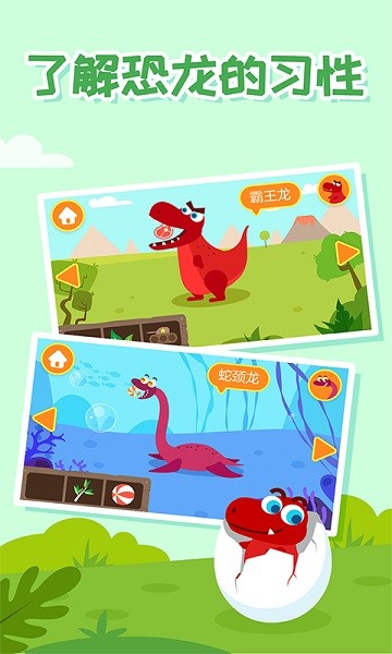 3、新增了多个恐龙主题场景,能引导小朋友认识更多种类的恐龙生物,而互动环节则进一步加深了宝宝对恐龙的认知与了解。