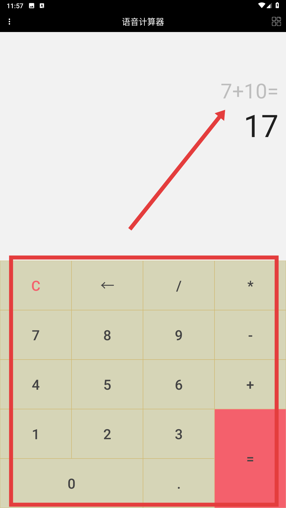 1、在语音计算器页面,通过数字及运算按键输入算式(如“7+10”),点击“=”得出结果。