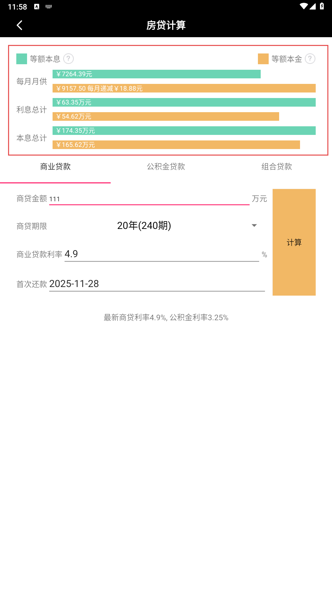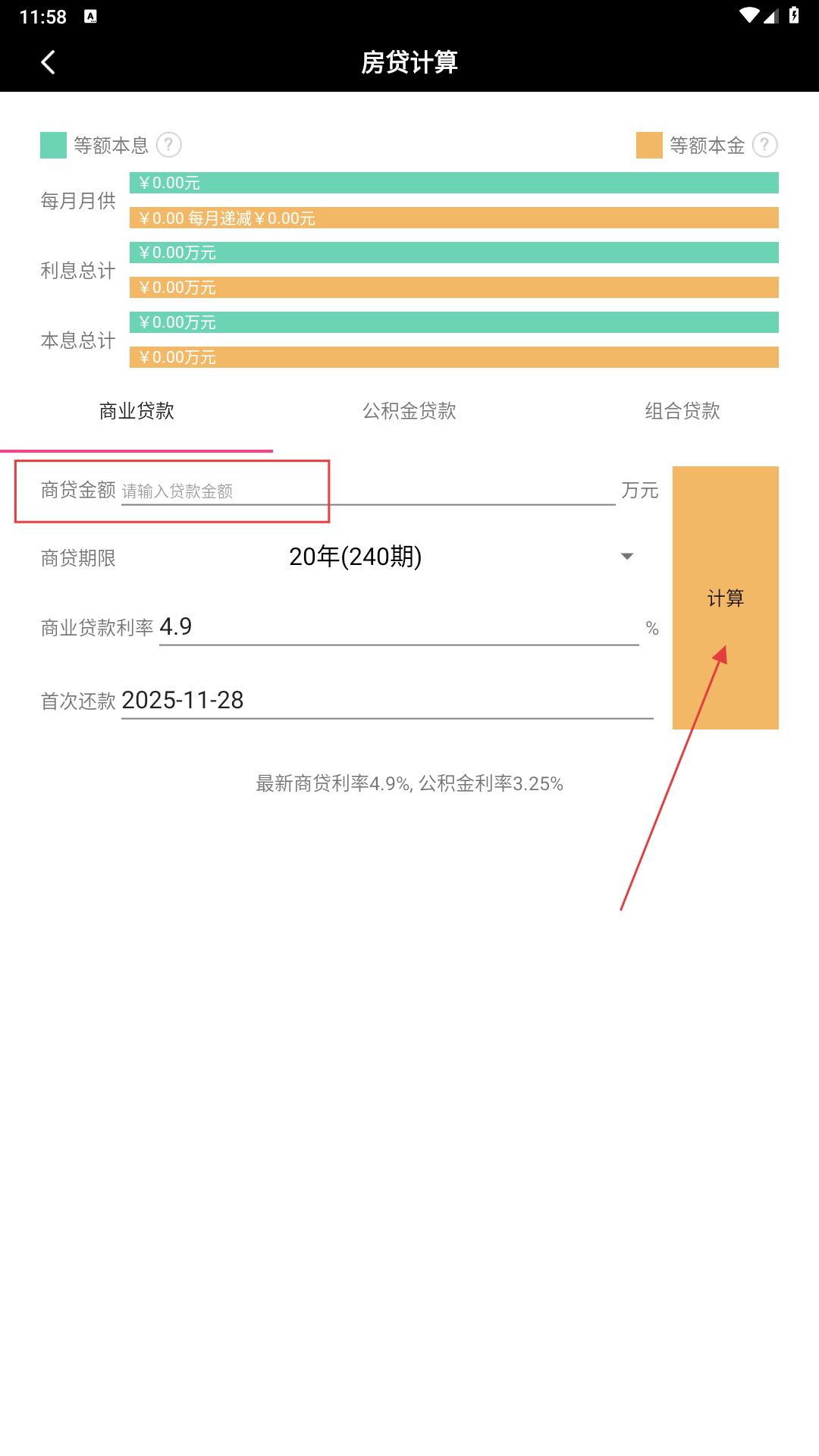 3、在房贷计算页,在【商贷金额-输入框】填写贷款金额,确认贷款期限、利率等参数后,点击【计算-功能按钮】。
