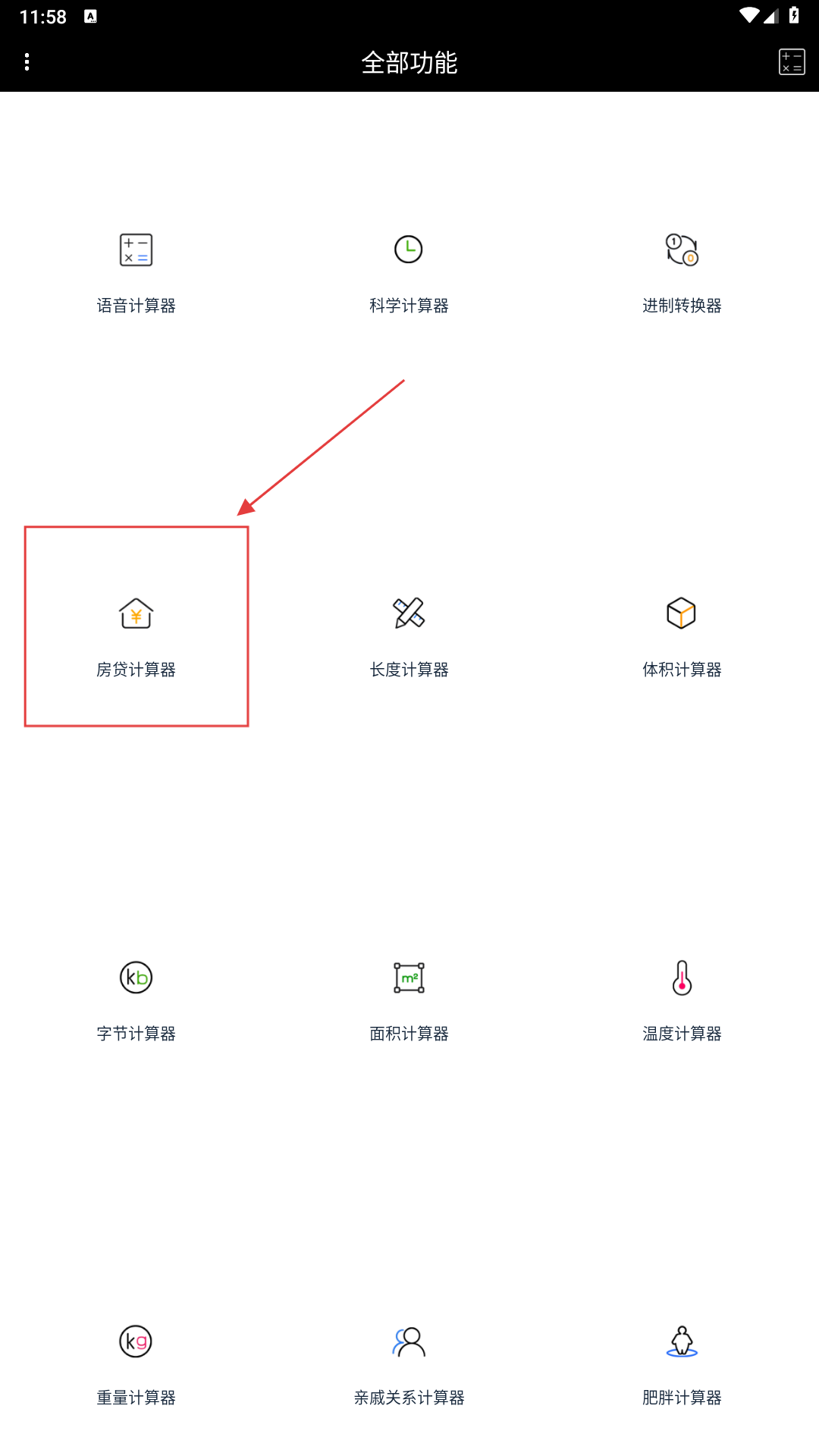2、进入全部功能页,选择【房贷计算器-功能选项】,进入房贷计算界面。