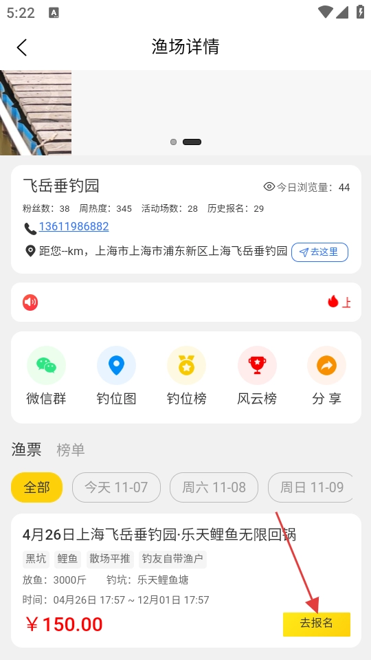 3、在渔场详情页面,点击【去报名】按钮,即可进入渔讯详情页面。