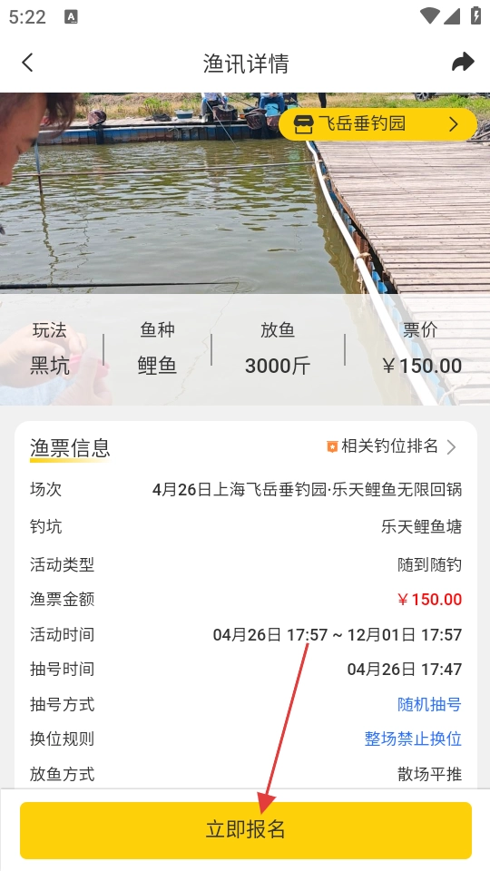 4、进入渔讯详情页面后,点击【立即报名】按钮,就能申请参与该渔场的渔票活动报名。