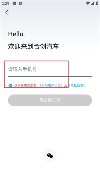 2、进入个人中心后,点击【登录/注册】板块,页面会跳转至合创汽车的登录界面,该界面提供手机号验证码登录的方式。