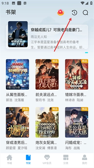 1、在书架界面,点击顶部的阅读记录图标。