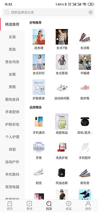 2进入后能看到五个功能板块,分别对应主页、资源库、货源搜索、收益查询和个人中心。点击主页板块,里面陈列着丰富多样的商品,可供用户浏览挑选并进行分享操作。