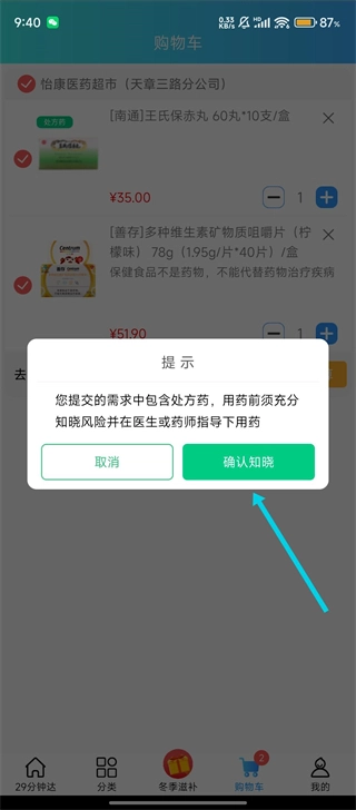 4、若包含处方药,会弹出提示框,点击【确认知晓】,即可继续后续结算步骤,按提示操作就能顺利买到药啦。