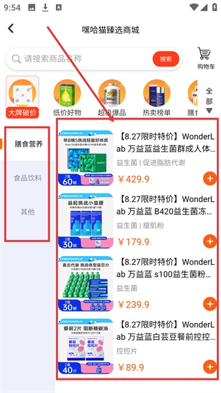 3、在商品分类页面,选择【膳食营养】分类,可查看该分类下的商品列表,如万益蓝益生菌等啦。