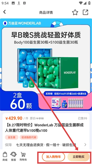 4、进入商品详情页后,可查看商品价格、详情等信息,点击【加入购物车】或【立即购买】,可进行购物操作哦。