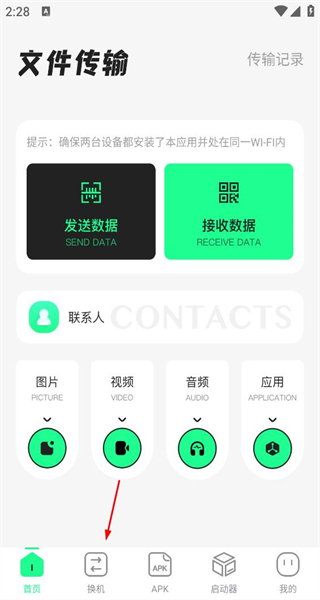 打开软件后,首页设有发送数据、接收数据等功能选项,点击“换机”按钮即可进入对应的换机助手操作界面。