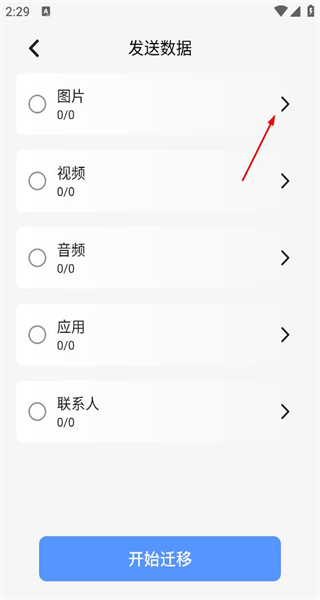 3、进入数据发送页面,找到图片、视频等迁移选项后,点击图片选项,即可进入对应的图片选择操作界面。