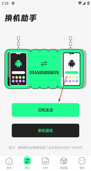 2、进入换机助手页面后,找到“旧机发送”和“新机接收”这两个选项,点击“旧机发送”,即可进入对应的发送数据选择界面。
