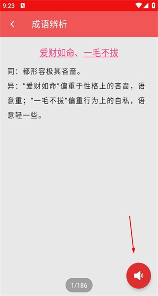 3、选择“爱财如命”与“一毛不拔”这一组,查看二者的相同点为都形容人极其吝啬,不同点则在于侧重点各异,可点击对应按钮收听相关内容。