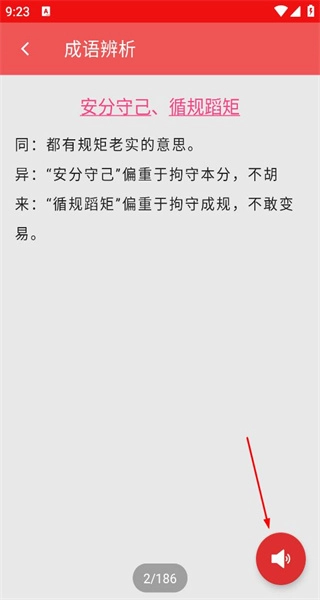 4、选择“安分守己”与“循规蹈矩”这一组,查看它们的相同点是都含有规矩老实的意思,不同点则在于侧重点各异,还可以点击按钮收听相关内容。