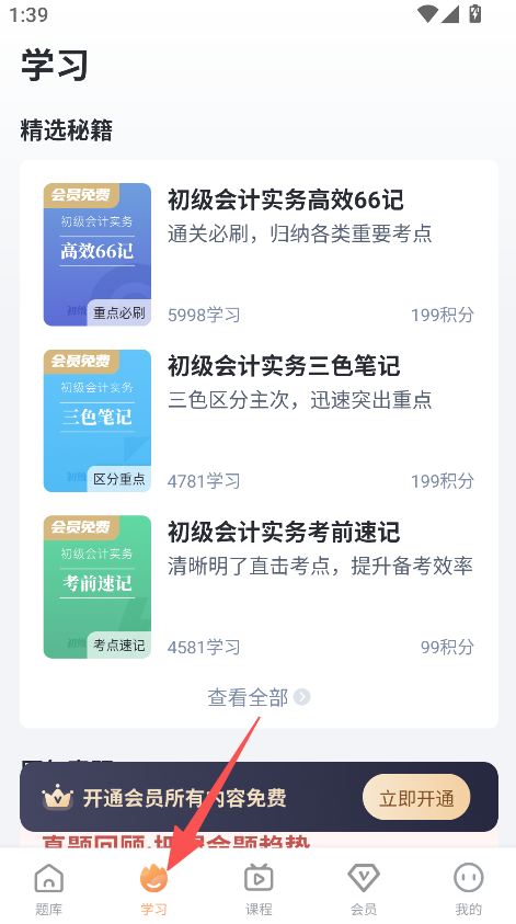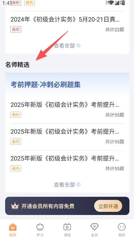 3、板块整合功能,把学习、题库、课程、会员这些板块整合到一起,考生能在同一个软件里获取多种备考资源,让备考路径得到优化。