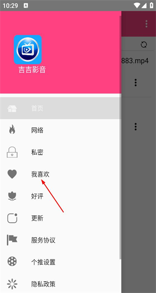 3、打开软件侧边栏菜单,找到并选择我喜欢选项,进入该分类对应的视频列表页面。