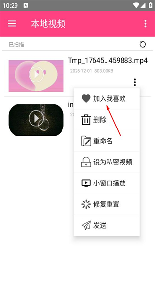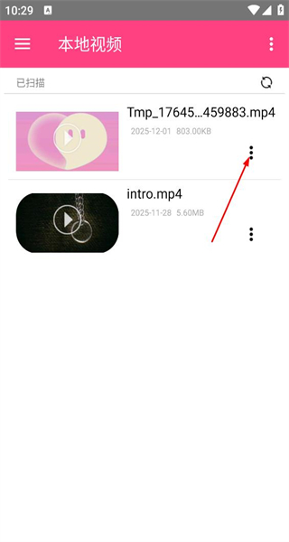 1、打开软件后,进入本地视频页面,查看已扫描的两个视频,选择第一个视频右侧三点按钮,准备执行后续操作。