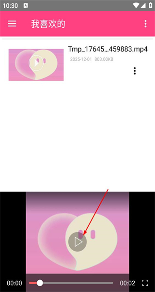 4、进入我喜欢的页面,找到已添加的视频,点击视频上的播放按钮,开始播放该视频内容。