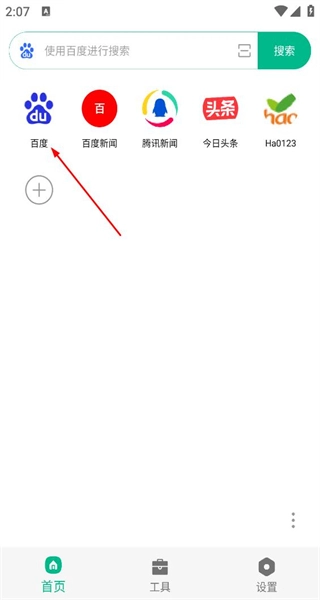 1、打开软件后,看到搜索栏及百度百度新闻等应用入口,点击百度图标进入对应的搜索操作页面。