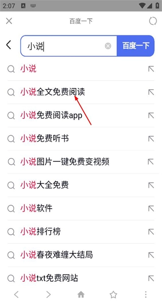2、进入百度搜索页面,在搜索栏输入小说,查看相关搜索建议,选择小说全文免费阅读的建议进行搜索。