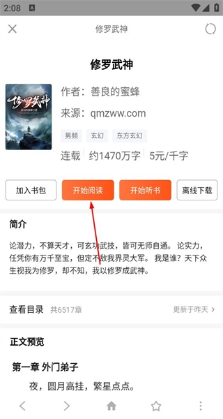4、进入修罗武神的小说详情页,查看简介等信息,点击开始阅读按钮进入该小说的阅读页面。