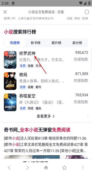 3、进入搜索结果页面,查看小说搜索排行榜等内容,选择修罗武神进入该小说的详情展示页面。
