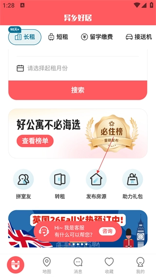 1、打开异乡好居首页后,找到并点击【发布房源】选项,即可进入房源发布相关页面。