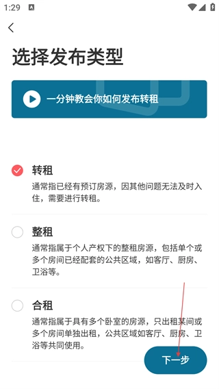 2、在房源页面找到【发布转租】按钮并点击,即可进入选择发布类型的页面。