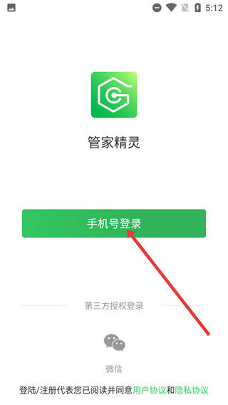 进入【管家精灵】页面后,可选择【手机号登录】的方式,登录前需要确认同意用户协议与隐私协议。
