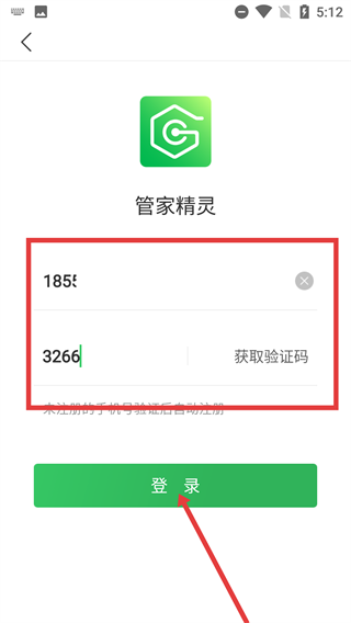 2、在【管家精灵】登录页面输入手机号,点击【获取验证码】并填写收到的验证码后,点击【登录】按钮;若该手机号尚未注册,系统在验证通过后会自动完成注册流程。