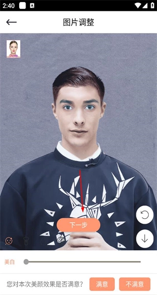 2、进入图片调整界面,查看短发在当前形象上的效果预览,确认无误后点击下一步,即可进入发型细节的设置页面。
