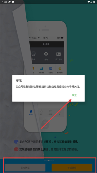 2、点击【智诚微信】按钮,此时会弹出公众号复制提示,接着前往微信,将复制的公众号名称粘贴进去进行搜索,找到后点击关注,这样就完成了关联操作,之后就能获取相关服务了。