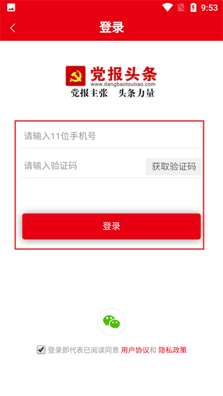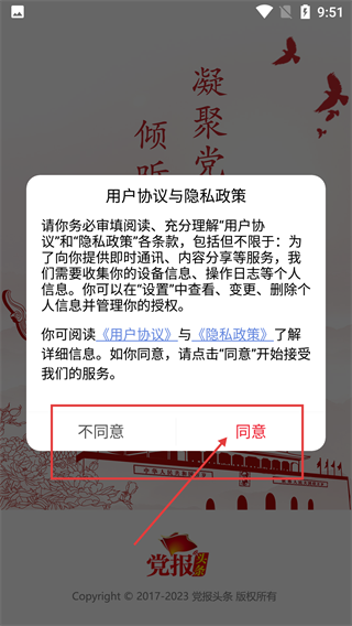 1首次使用党报头条时,需点击【同意】按钮,在同意《用户协议》与《隐私政策》后,即可正常使用软件功能。