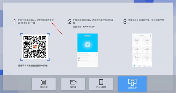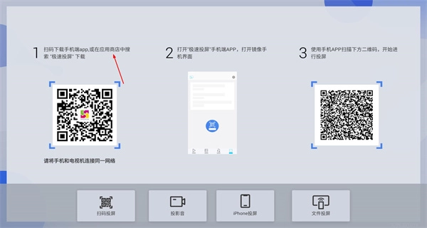 1、启动软件后,进入扫码投屏界面,按照页面展示的步骤操作;确保手机与电视连接至同一网络后,依据提示完成扫码相关的操作流程。