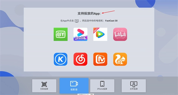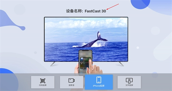 3、进入iPhone投屏界面,找到显示为“FastCast30”的设备名称,按照界面提示进行操作,即可完成手机至电视的投屏展示。