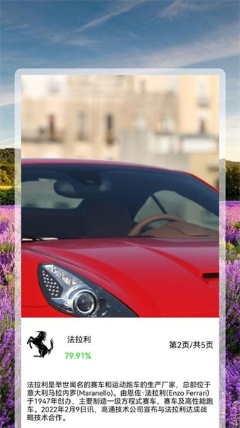 2、仅需拍摄汽车照片,软件就能精准识别汽车的品牌、型号等信息,让你快速知晓所见汽车的相关背景与特点;