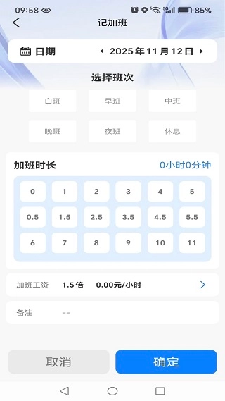 2、在记录页面,确定班次、加班时长、工资等信息,保存即可。