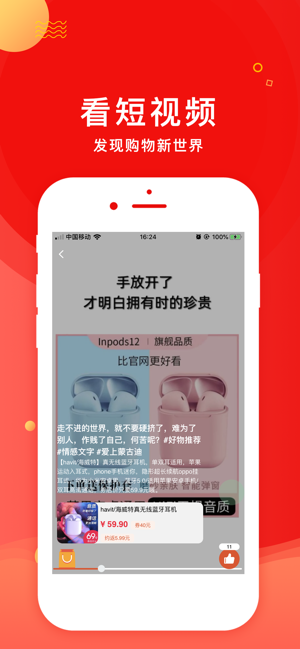短视频导购,带来更真实的购物体验。无需担心商品图片精美诱人,收到的实物却与预期大相径庭的情况。