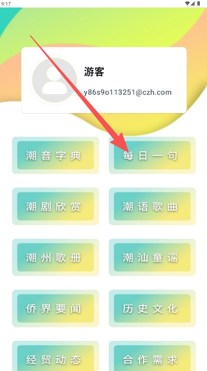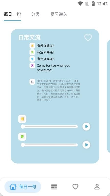 2、每日一句板块会挑选实用的短句,呈现中文、英文和潮州话的三语对照版本,同时配备真人发音演示。